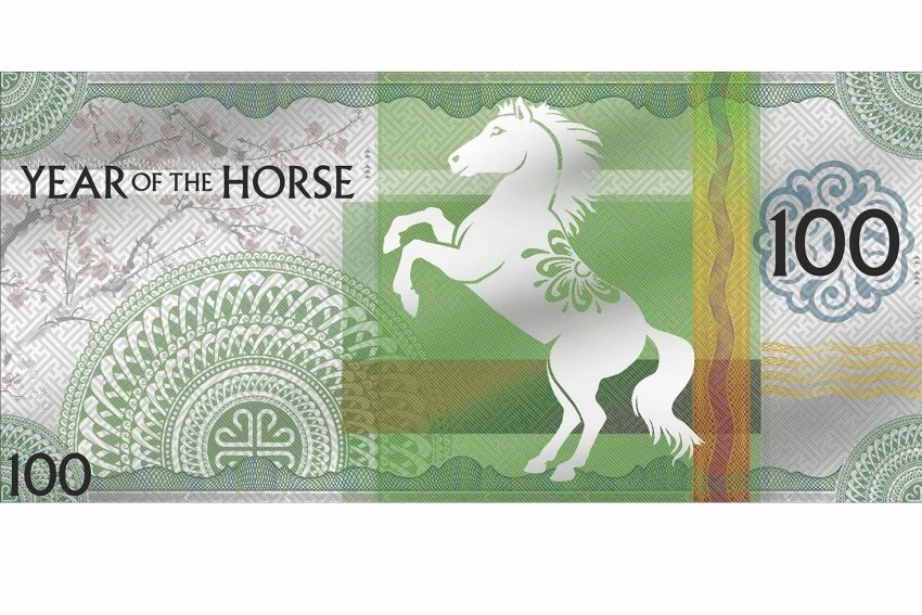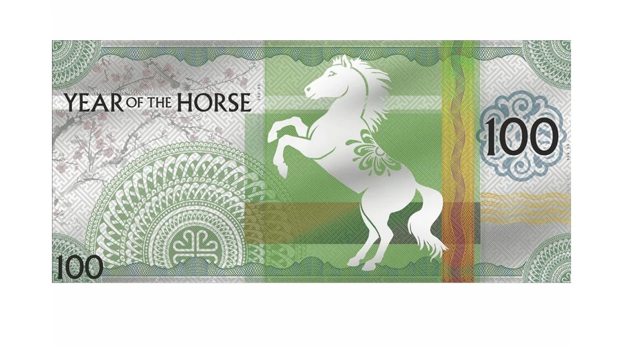 . Az ilyen évben születettekre a függetlenség, a kalandvágy jellemző. Az ezüst bankjegyen ágaskodó ló ezt az energiát jeleníti meg. Csupa meglepetés ez a bankjegy, mivel érmeként készült. Színezüstből, tükörveret kivitelben verték. Ritka megoldás, különleges darab.