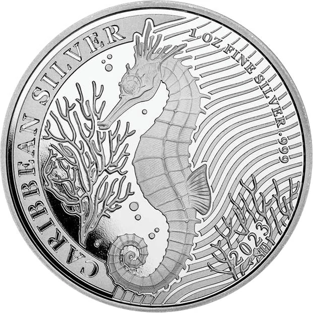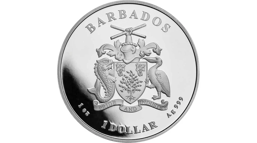 Barbados a Karib-térség szigetállama. Zászlaján a kék sávok tengert és az eget, az aranysárga a parti homokot jelképezi, a zászló közepén pedig egy szigony jelenik meg. Mindez a sziget lakói és a tenger szoros kapcsolatára utal. Egy uncia színezüst érméjén a szigetvilág korallzátonyain őshonos