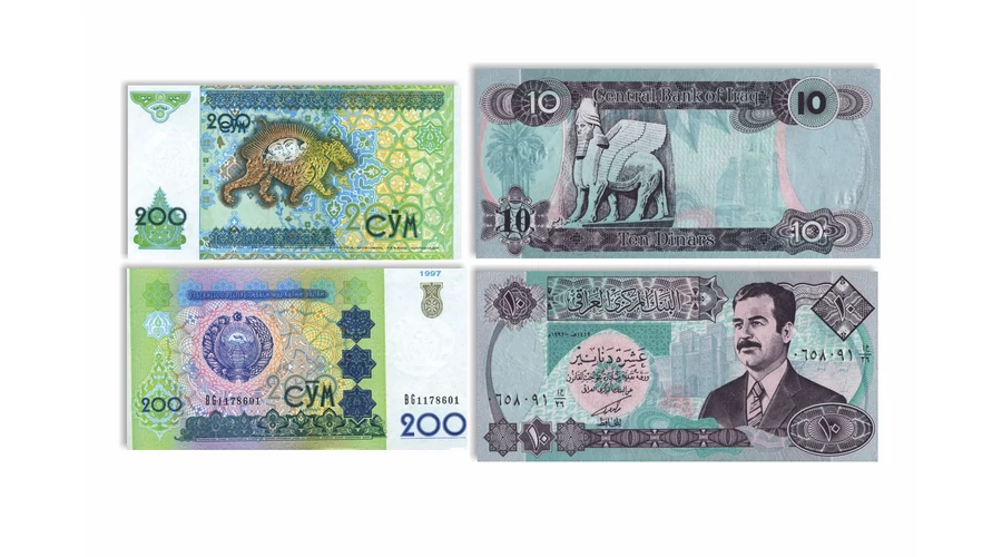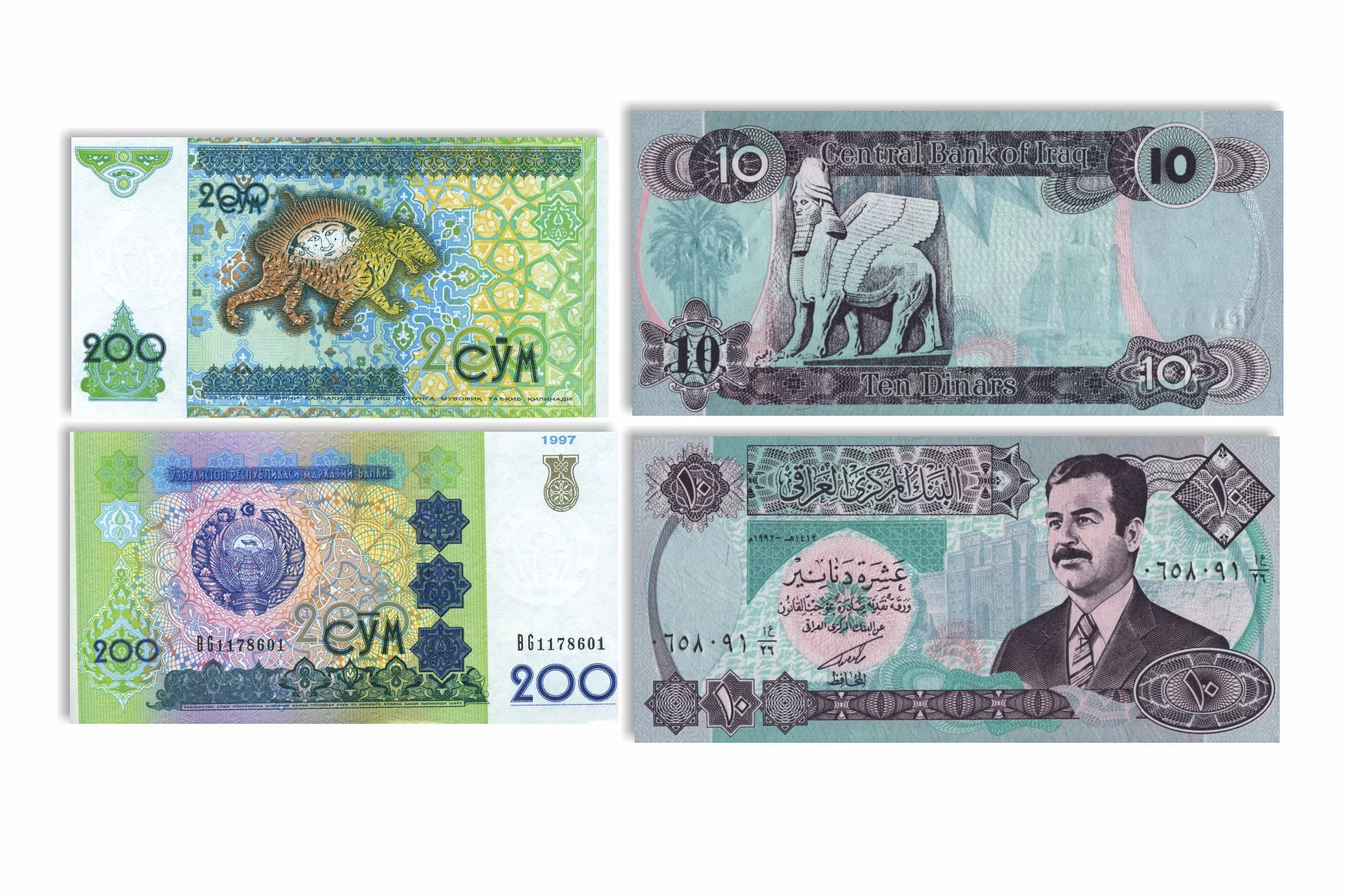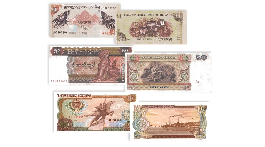 Misztikus állatok egzotikus bankjegyeken, 5 ngultrum, 50 kját, 10 von, 200 szom, 10 dínár , Buthan, Myanmar, Észak-Korea, Üzbegisztán, Irak, ND