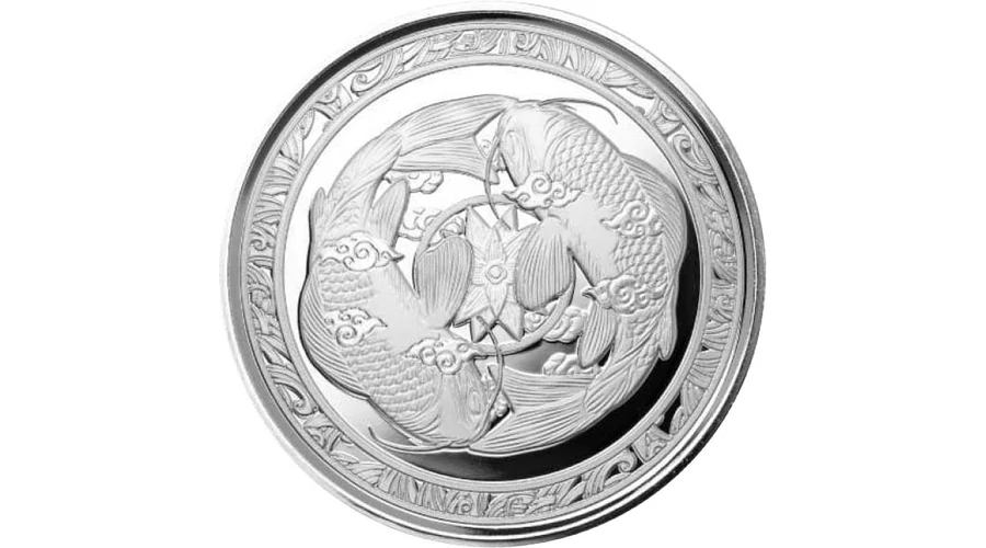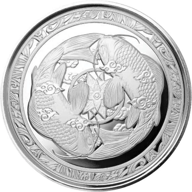 is lehet ez a színezüst érme koi halakkal. A keleti kultúrákban a hal a jólét és a gazdagság, a siker és a hosszú élet szimbóluma. A legenda szerint a koi a legkitartóbb hal, árral szemben felúszik a vízesés forrásához, ahol sárkánnyá változik.